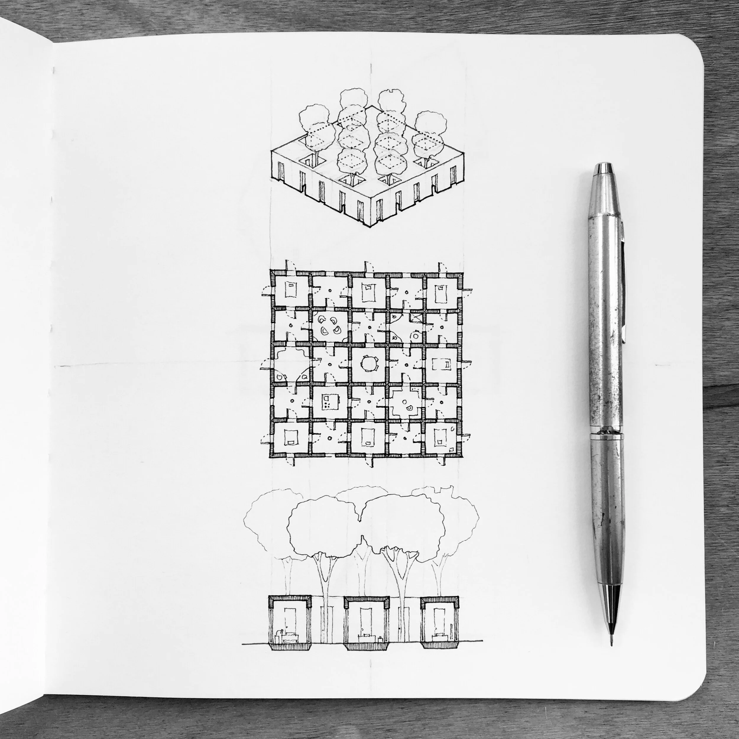 One House Per Day no.131 is a 25-square checkerboard of open and enclosed spaces such that each enclosed room is separated from each other room by a courtyard.