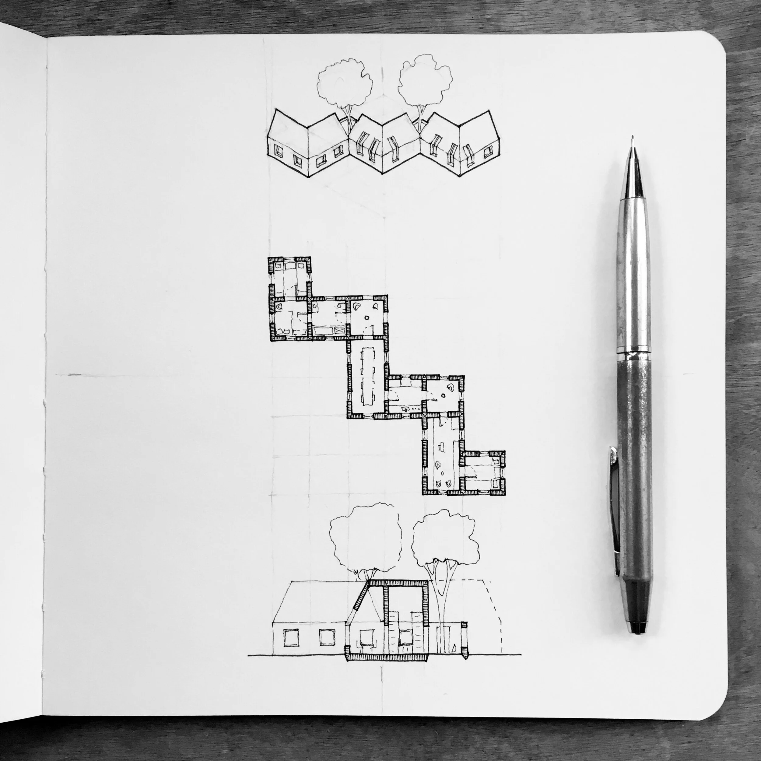 One House Per Day no.189 is a zig-zagging arrangement of L-shaped volumes linked by corner entry courts.