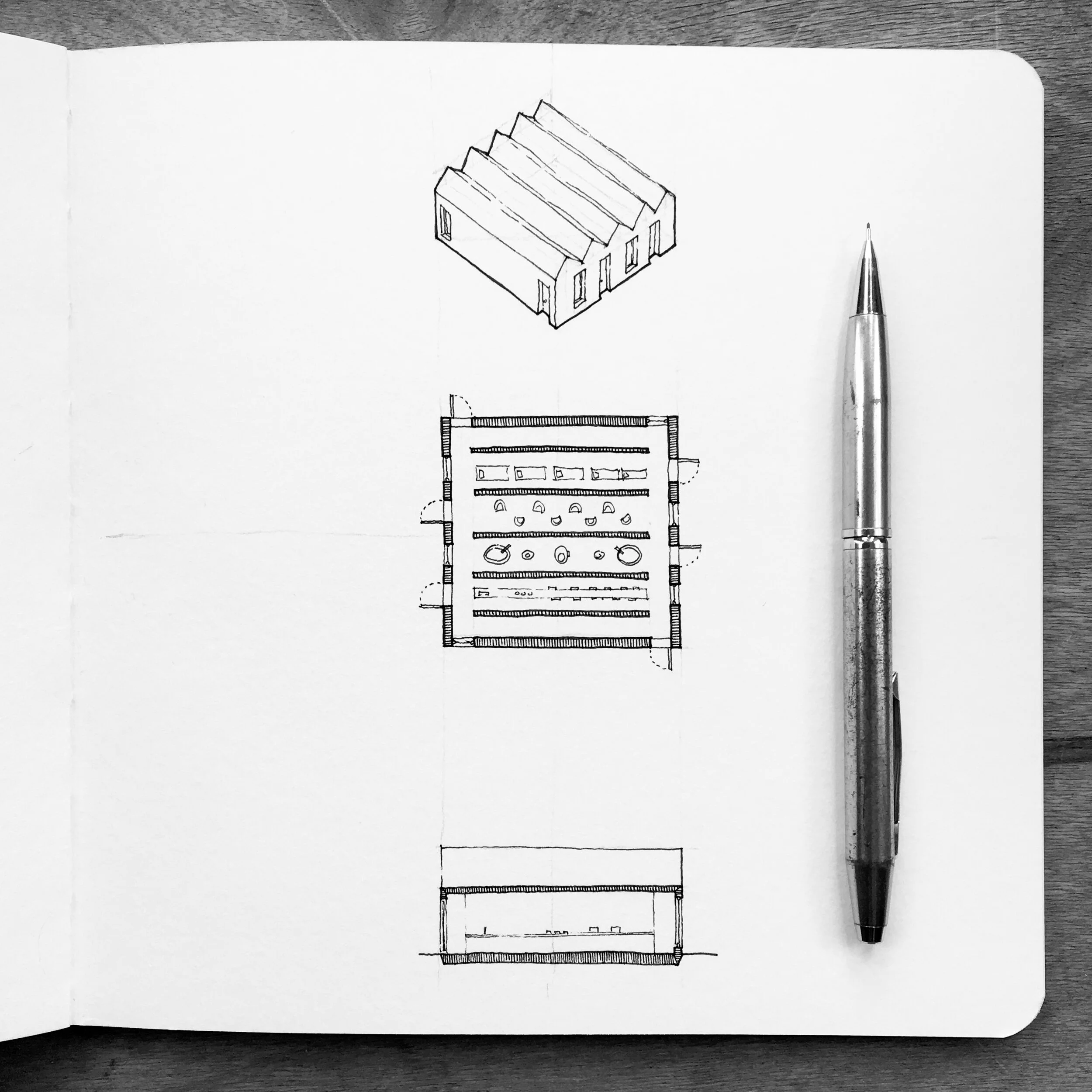One House Per Day no.091 is a square room with a sawtooth roof overhead. Long walls aligned with the ridge lines of the roof create spatial and programmatic subdivisions within the room.