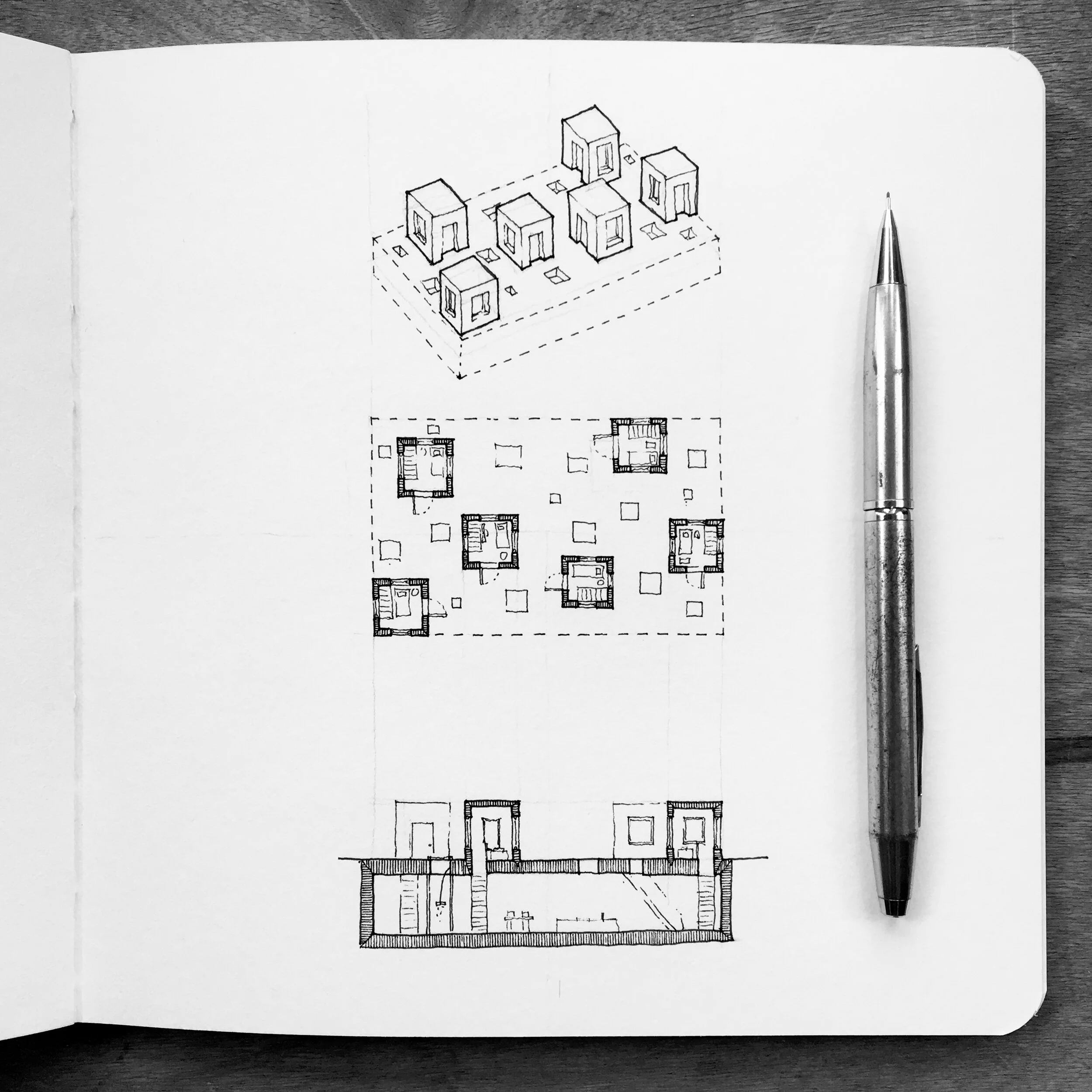 One House Per Day no.087 has a continuous underground, cavernous common room with private sleeping quarters above ground.
