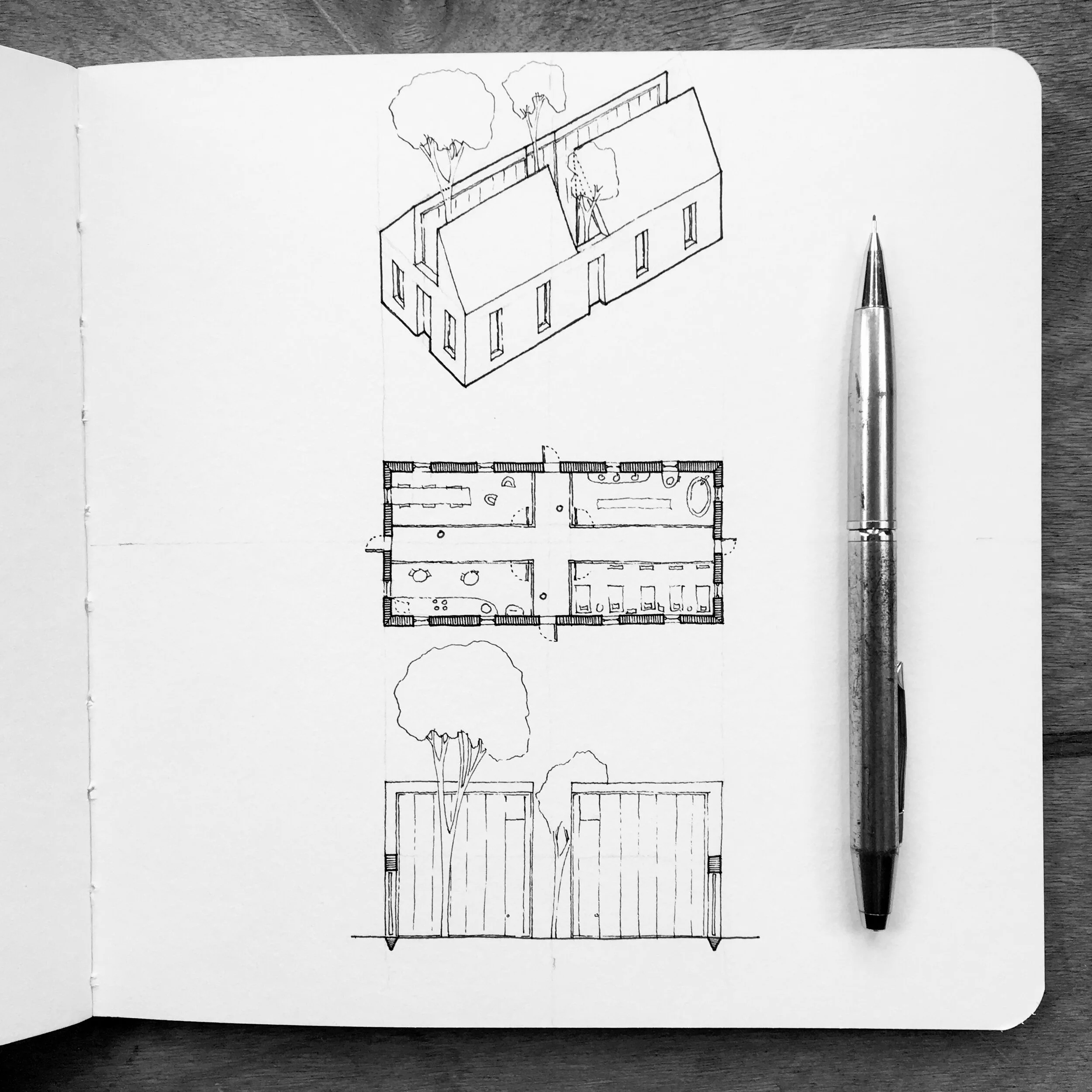 One House Per Day no.089 is a long gabled volume that is eroded by a cruciform courtyard into four distinct volumes within a continuous exterior wall.