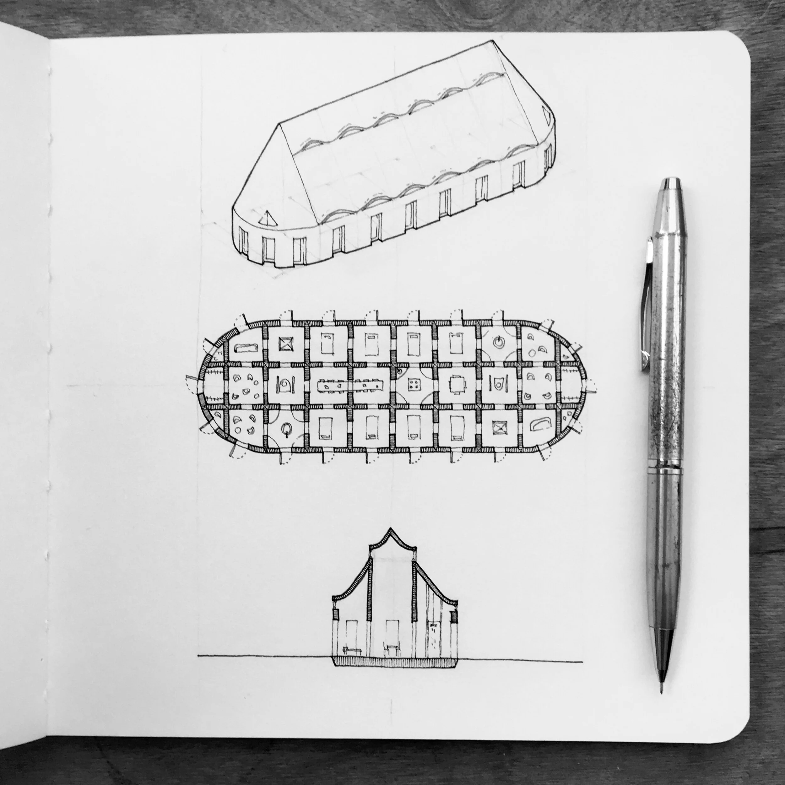 One House Per Day no.107 is a longhouse with an internal matrix of rooms and (non-sneaky) eyebrow dormers.