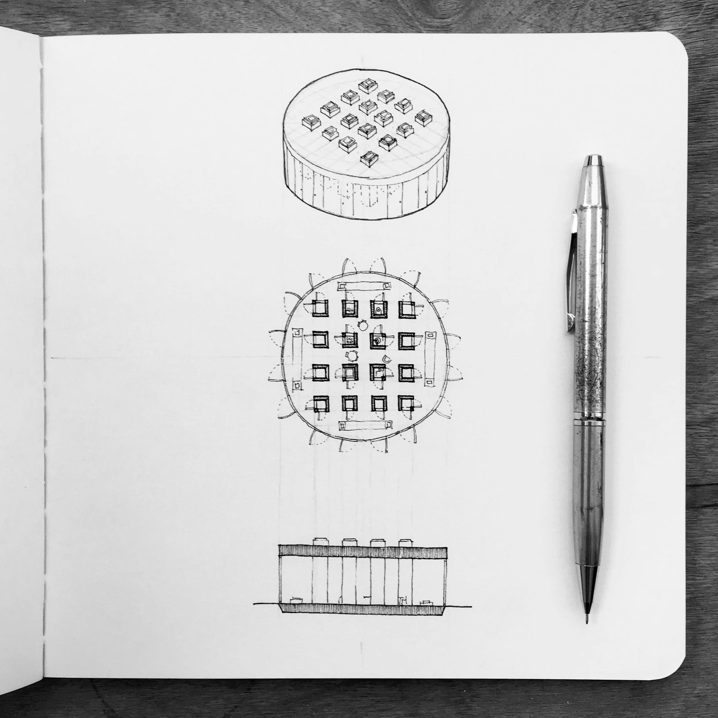 One House Per Day no.109 is a circular room with a 4x4 grid of wide, square, hollow, inhabitable columns which contain plumbing fixtures, appliances, and storage spaces.